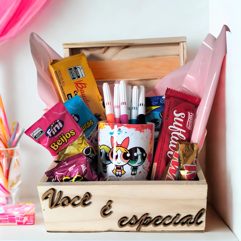 O Presente com Caneca Meninas foi criado para proporcionar uma experiência lúdica e memorável. Com uma caneca personalizada para pintar das Meninas Superpoderosas e uma seleção de doces, ele é ideal para presentear crianças com criatividade, sabor e carinho.